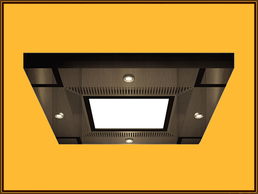 钢板喷涂、镂空和乳白色透交板、配以筒灯照明。
